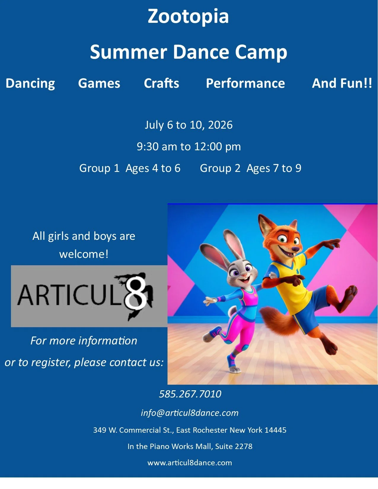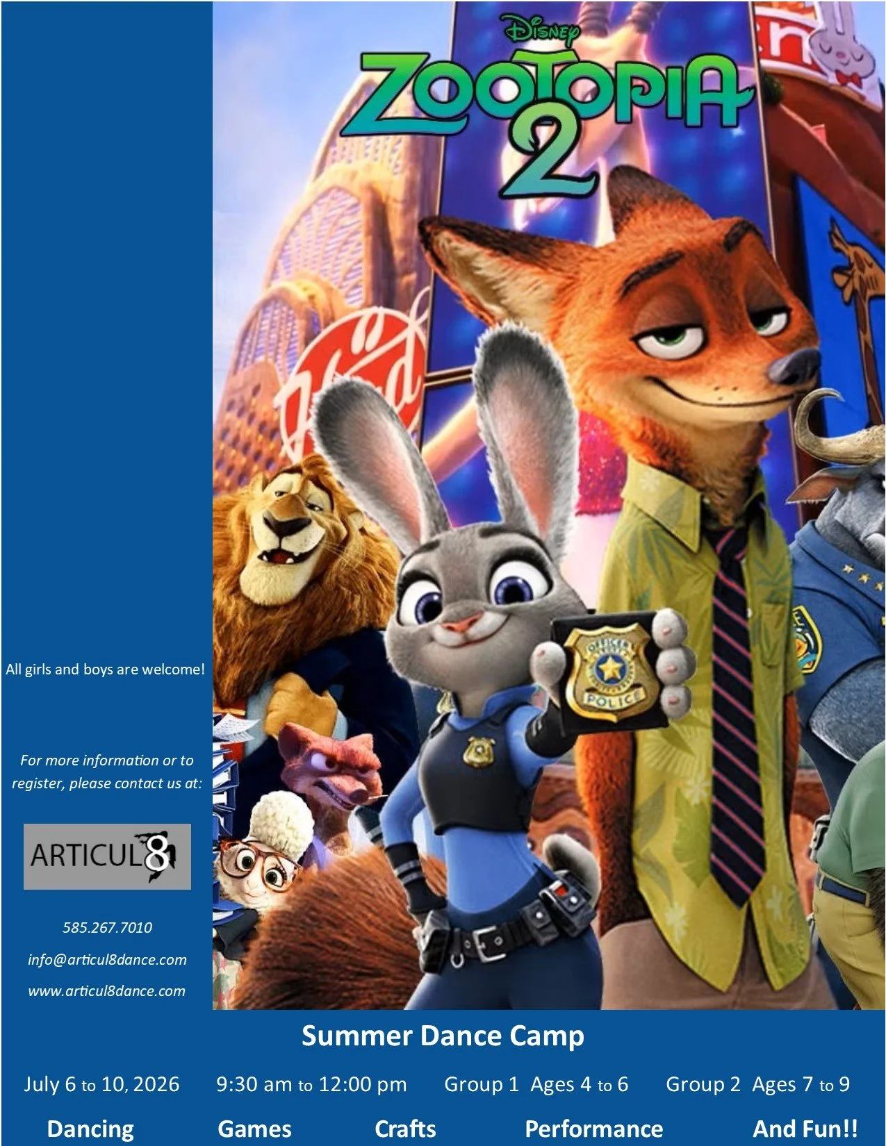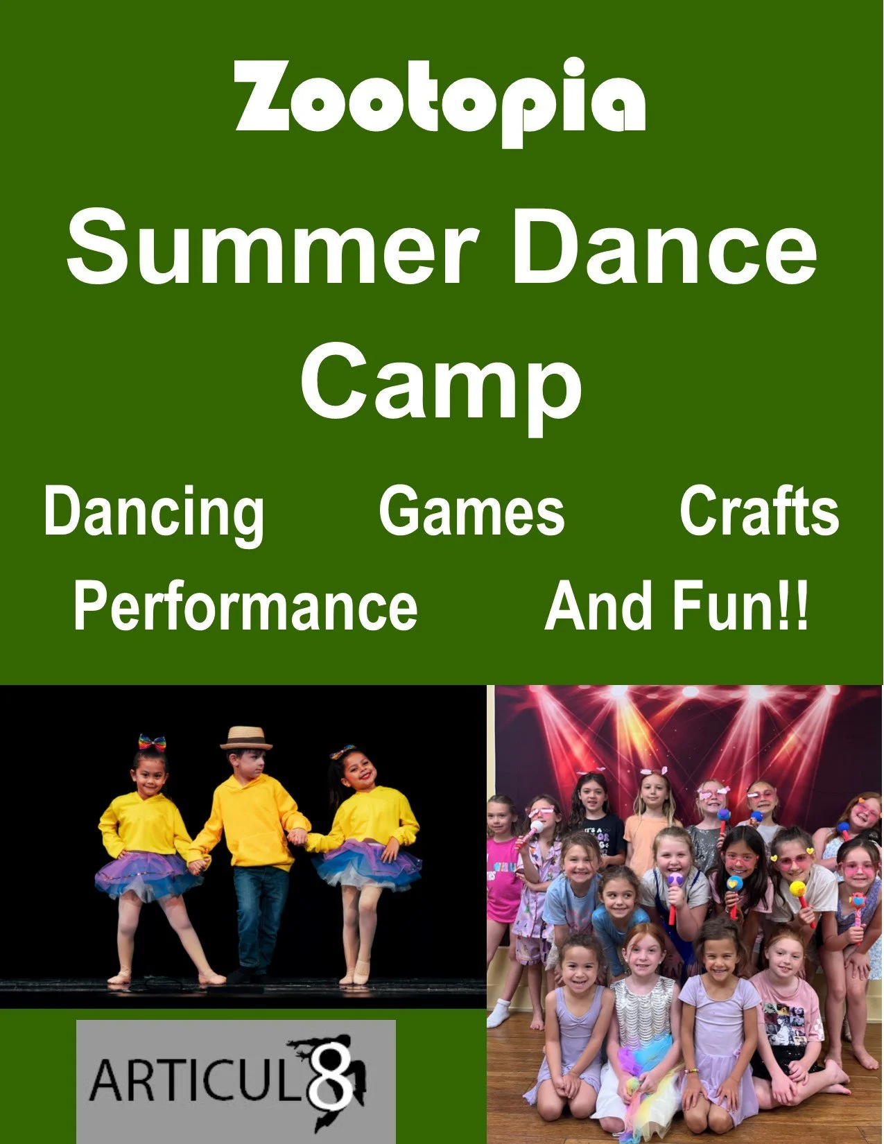 Join Articul8 Dance for a wild week inside the world of Zootopia! Boys and girls of all levels will learn an exciting dance to perform at the end of the week while enjoying games, crafts, and creative movement in Articul8’s warm, encouraging environment. Our instructors help every child build confidence, coordination, and joy through dance.